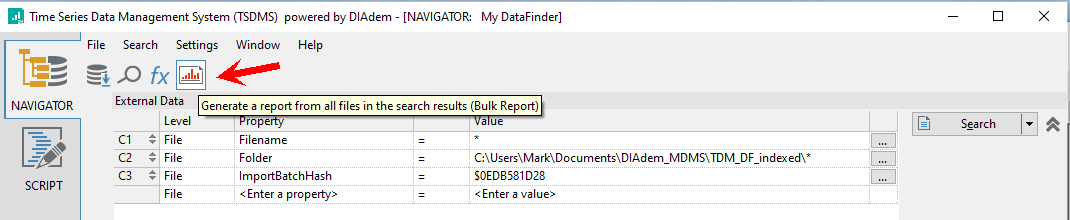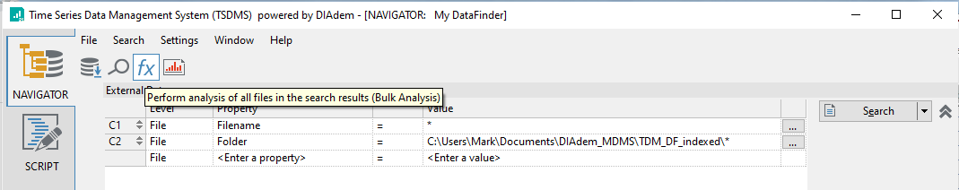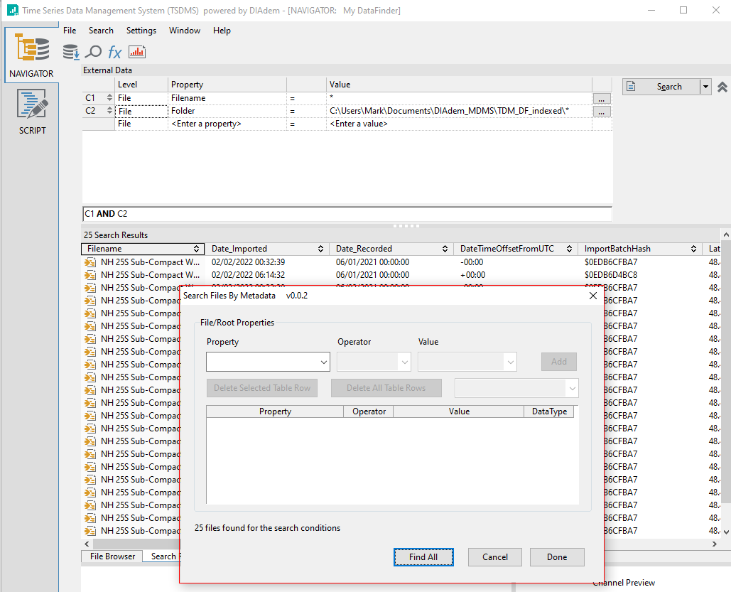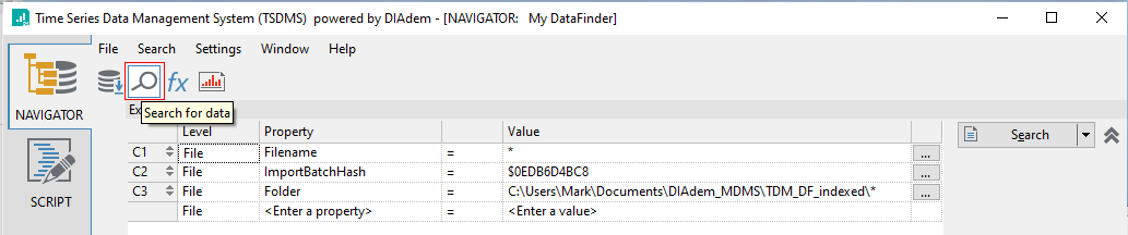 Note that the NI DIAdem Navigator search interface is fairly easy to use. After using Search by Metadata a few times, you will likely begin using the Navigator advanced search user interface directly. This is highly ecouraged, because Search by Metadata was created only created to make searching very easy to perform for a first-time beginner.