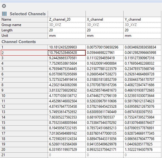 A 2D data structure consists of an x-channel and y-channel(s) with the same number of values in the X and Y channels. The most common configuration is one x-channel, and one or more y-channels within the same channel group. It is also possible to have pairs of X and Y channels within the same channel group. Waveform channels contain both the X and Y parts within the same channel.