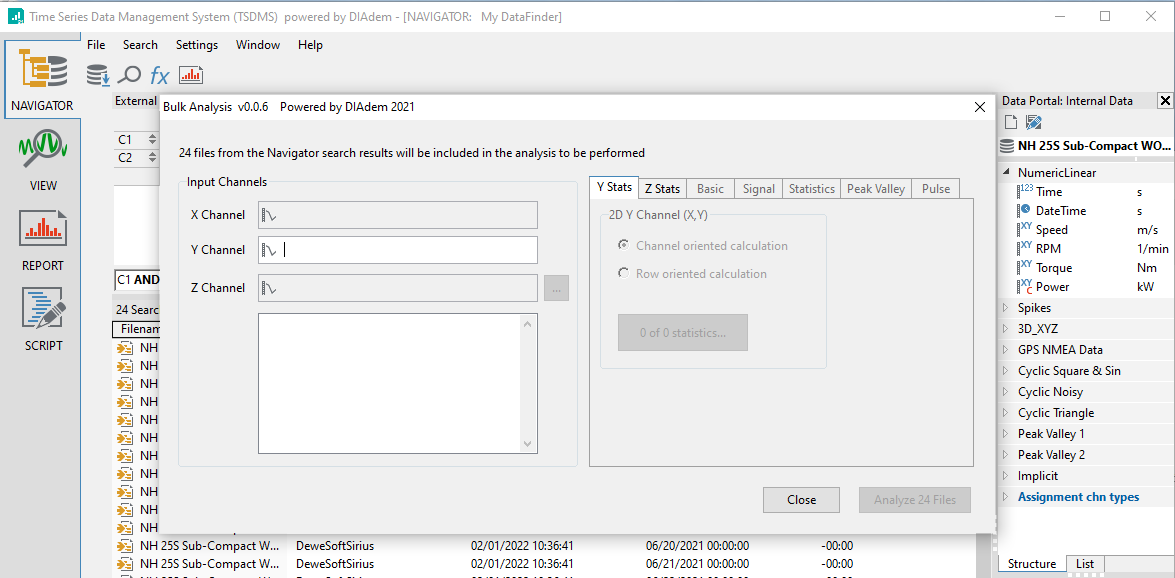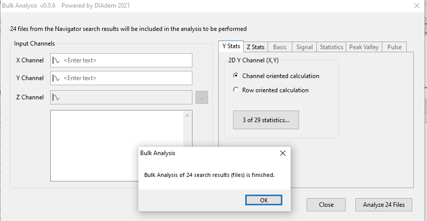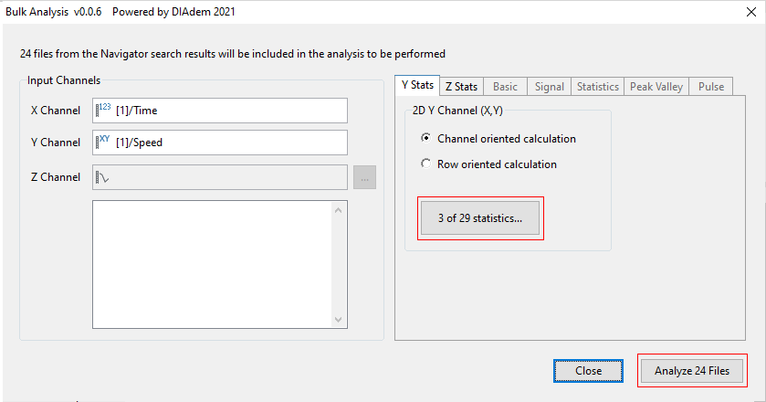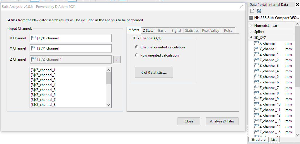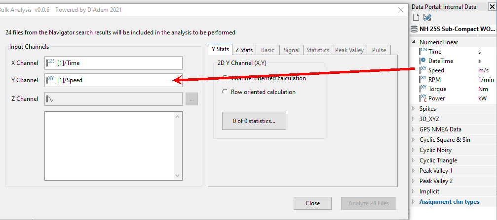 Choose a numeric Y-Channel from the Data Portal by clicking on it, and then drag and drop it into the Bulk Analysis 'Input Channels' field labeled "Y Channel". Bulk Analysis will allow you to only drop 2D and 3D numeric channels. The X Channel will be automatically identified. If the data structure is 3D, then the Z Channels will also be automatically identified and assigned to the appropriate field in the dialog. Note also that on the 'Y Stats' tab, the button below labeled "# of # statistics..." will be enabled after a 2D channel is dropped into the Imput Channels area.