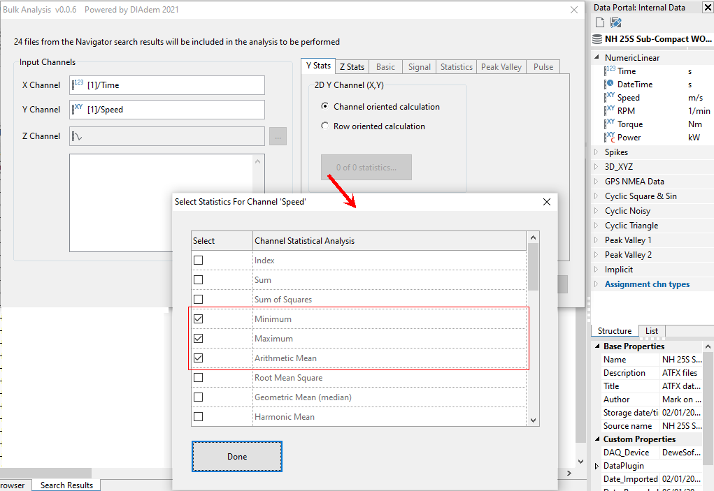 Click on the button labeled "# of # statistics..." on the 'Y Stats' tab to see a list of statistics that can be performed on the Y-Channel. Choose 'Minimum', 'Maximum', and "Arithmetic Mean' by checking the corresponding checkboxes. Click the 'Done' button when finished.
