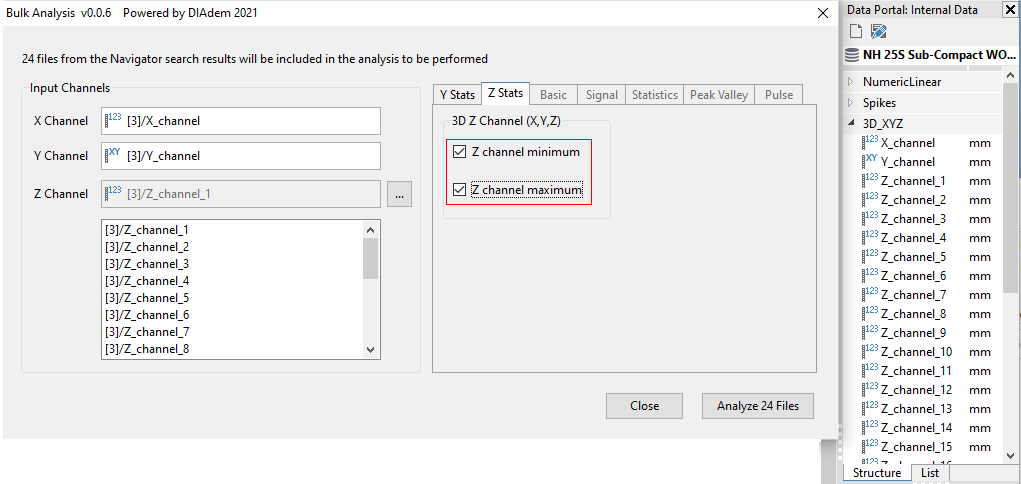 When the channel consistency check is complete, the Bulk Analysis application will run and will appear as shown below. The first file from the search results is loaded into the Data Portal (shown on the very right). The application is non-modal, so you may click on and explore the Data Portal contents as needed.