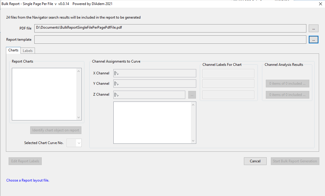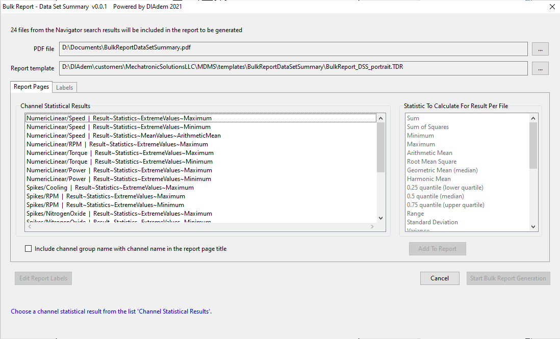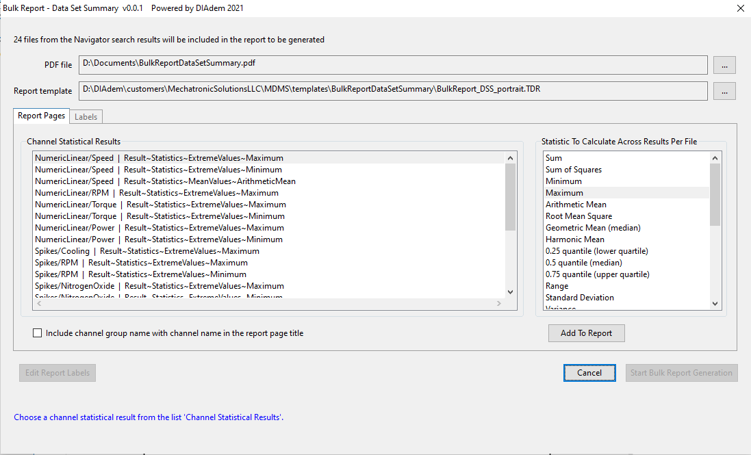 When Bulk Analysis starts, it will check the search results and insure that at least one set of channels are common among all of the files. This prevents you from starting an analysis that will fail to generate a complete analysis of the set of files from the search results because one or more of the files doesn't have any channels in common with the set. The check can take some time if you have many search results, but the check will insure that you don't attempt to perform an analysis on a set of files that don't have consistent channel contents. The message bar at the bottom of the DIAdem application window will display the progress of the search.