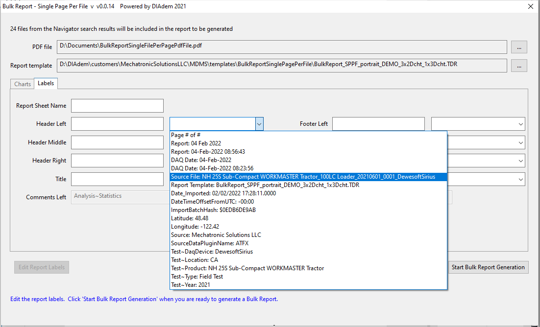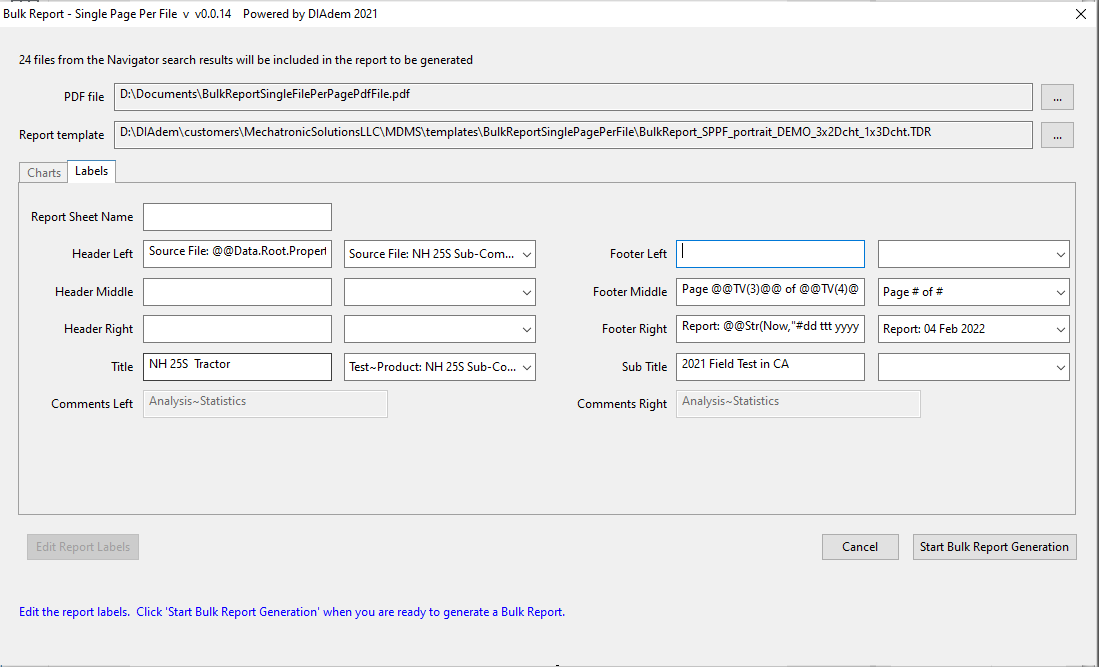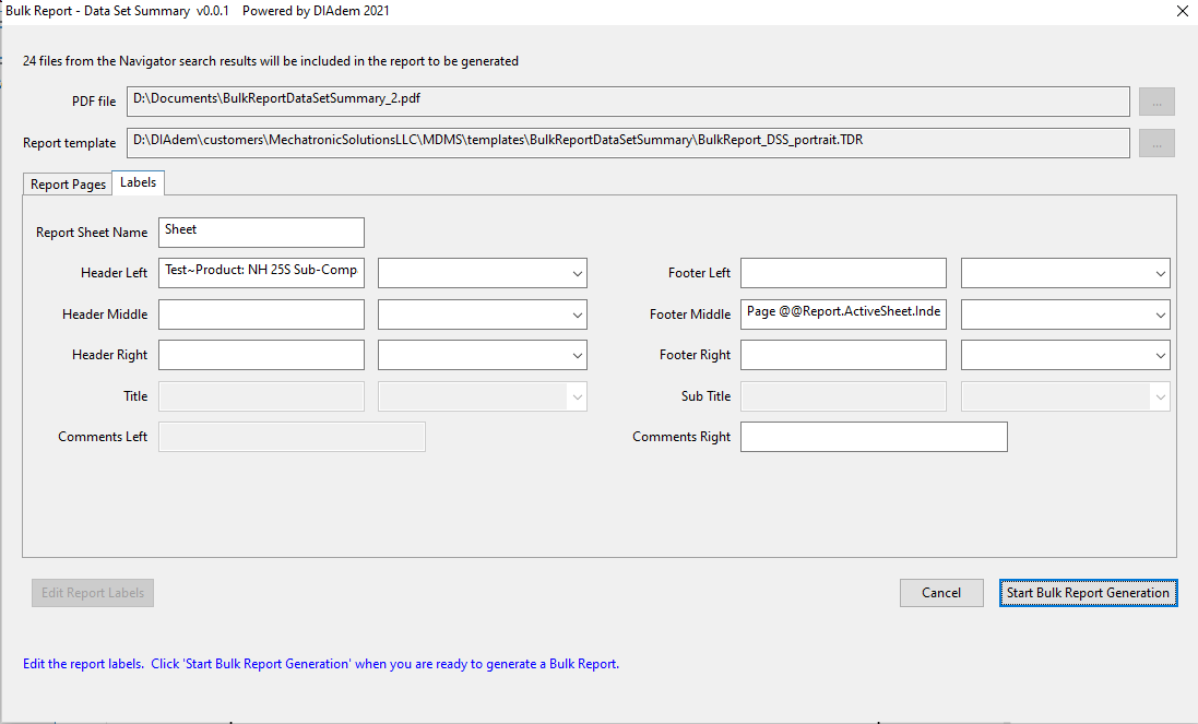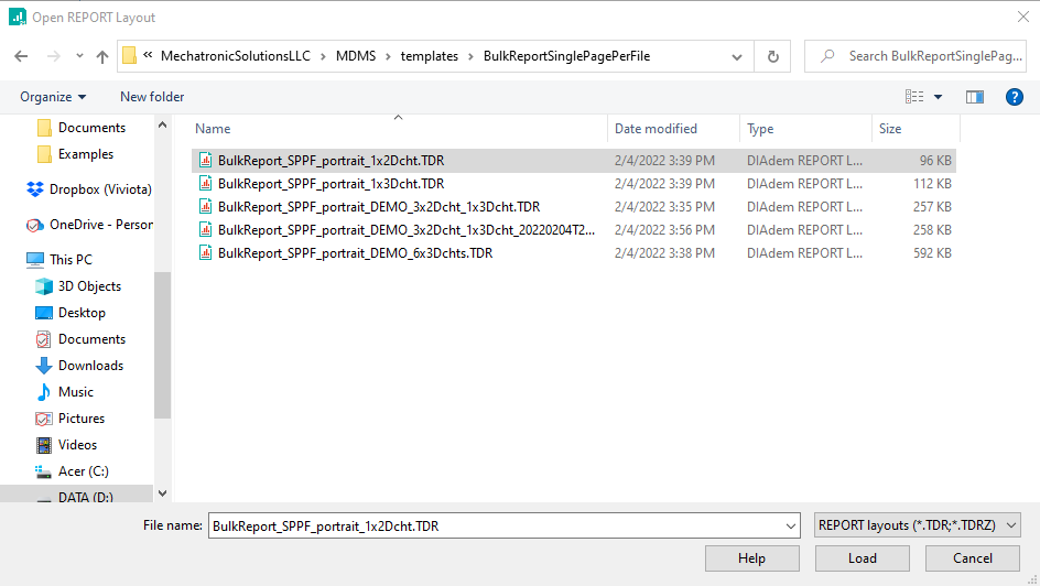 IMPORTANT: You need to select the appropriate type of report template based on the type of Bulk Report you wish to use the revised template with. Use templates in the folder named 'BulkReportSinglePagePerFile' only for the Bulk Report option 'Single Page Per File'. Use templates in the folder named 'BulkReportDataSetSummary' only for the Bulk Report option Data Set Summary. Additionally, never attempt to use the report templates named 'BulkReport_DSS_TblOfFiles_landscape.TDR' or 'BulkReport_DSS_TblOfFiles_portrait.TDR'. Never attempt to update/overwrite the report templates that come with the TSDMS installation. Instead, save them to a new file, within the appropriate folder.