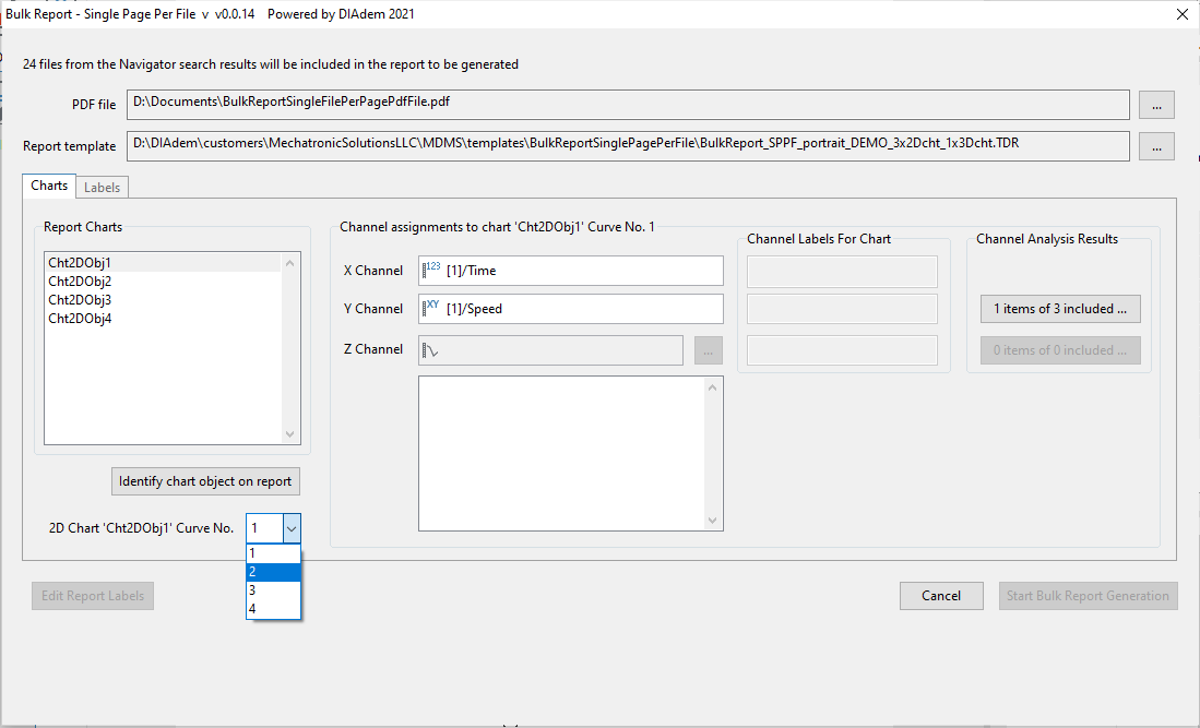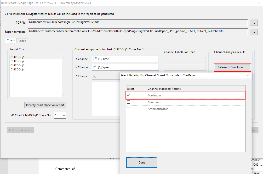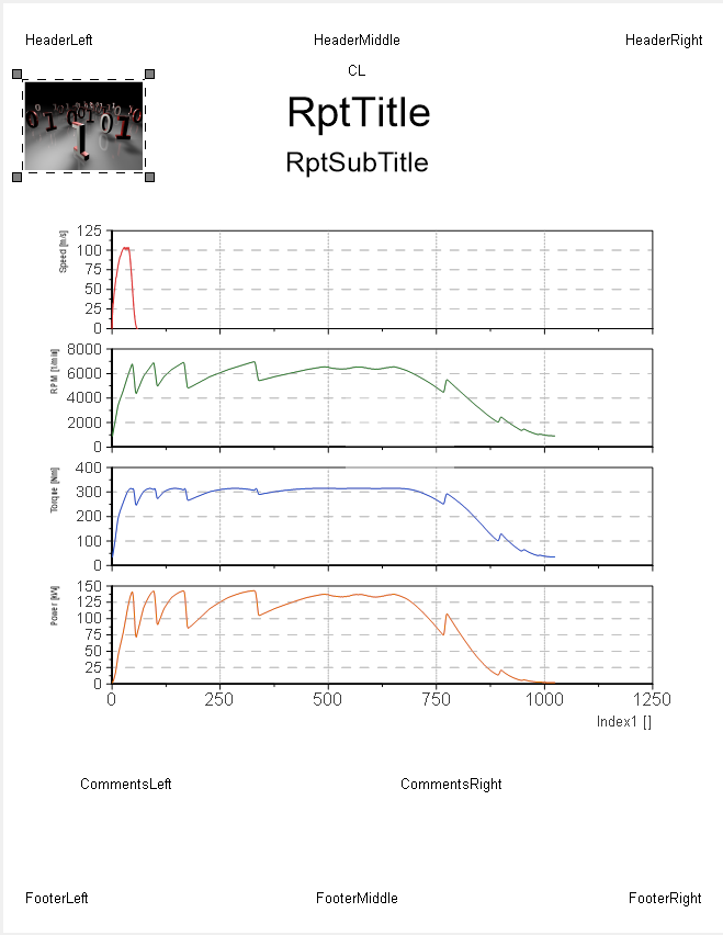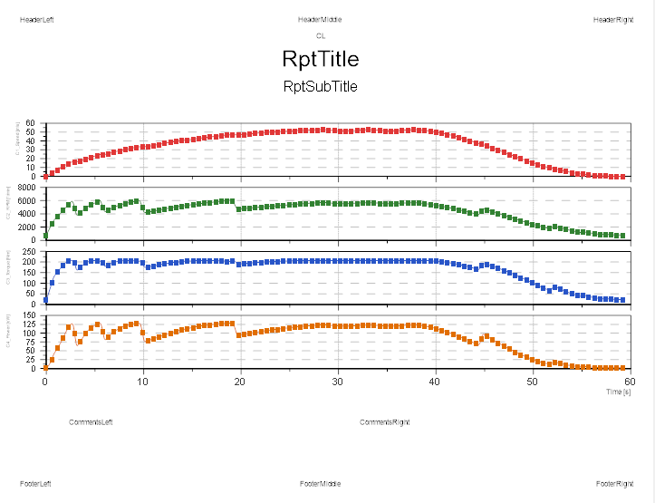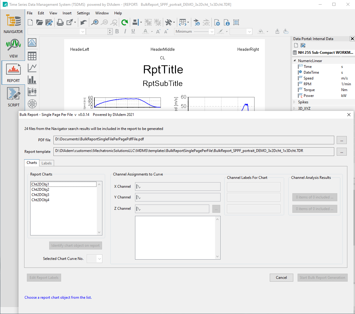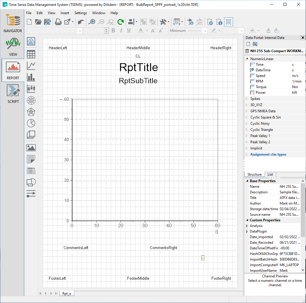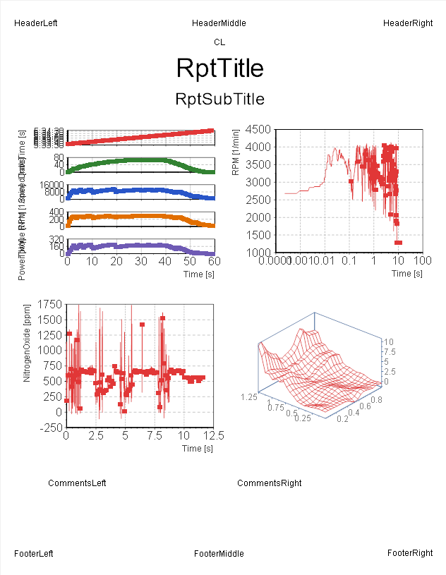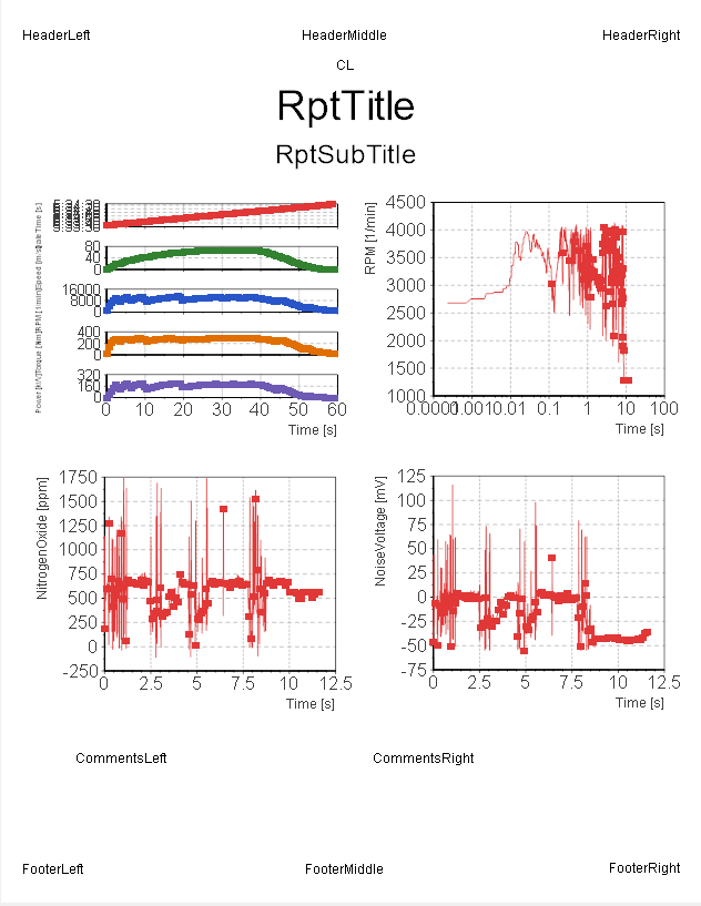 Generate a custom report that documents data and results using the DIAdem REPORT panel. You can use any combination of 2D/3D chart axis system, tables, text, and graphic objects in a report. You may generate multiple pages in the report, but each page must connect to data currently in the Data Portal. Report pages from multiple files can be accomplished by exporting the data to a PDF file for example, and manually appending it from REPORT sequentially from each file. Report templates may be created with custom layouts, logos, and formats to support easier generation of routine reports.