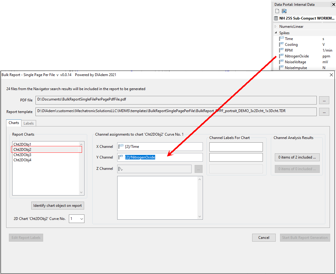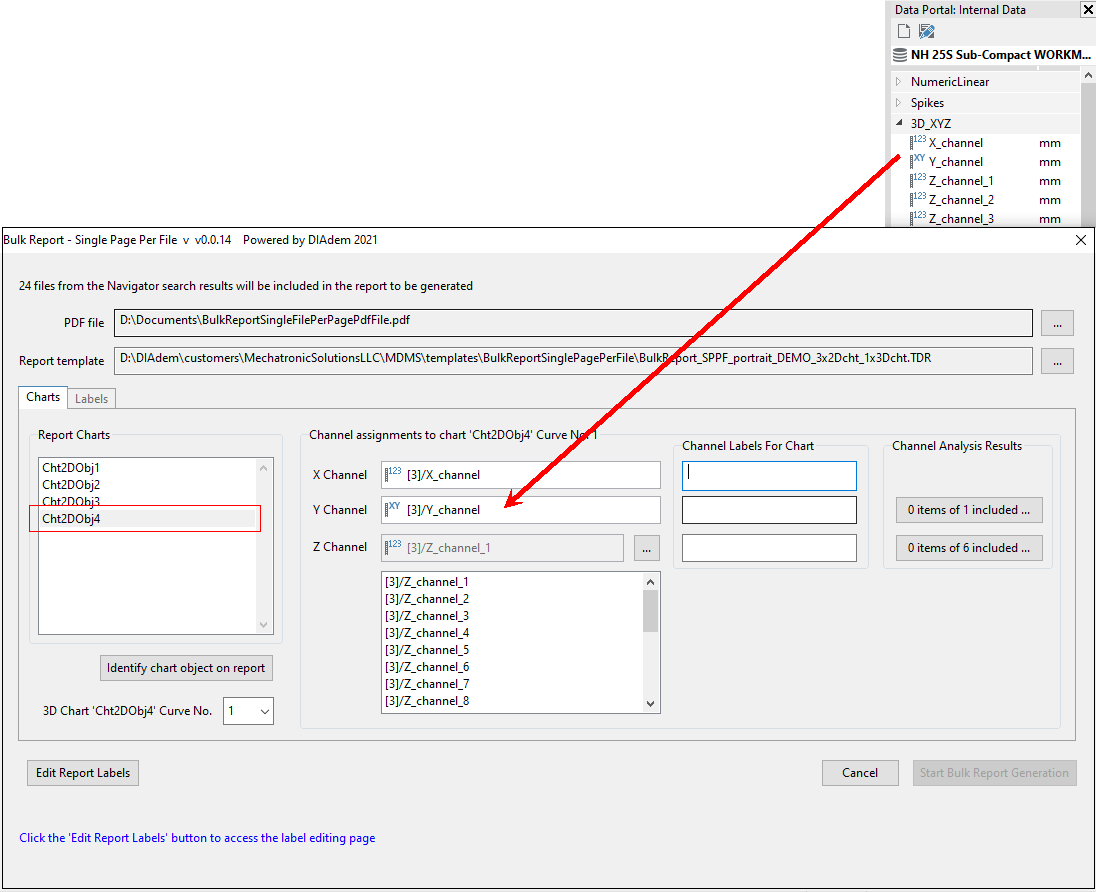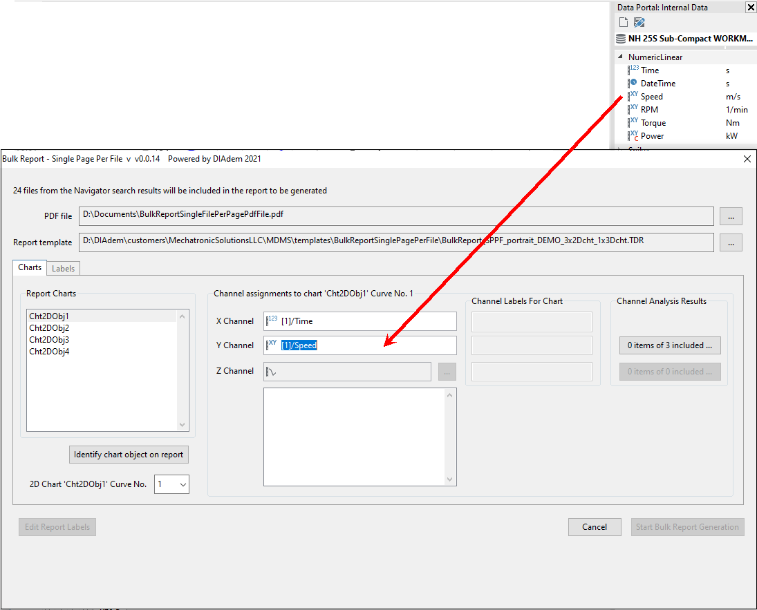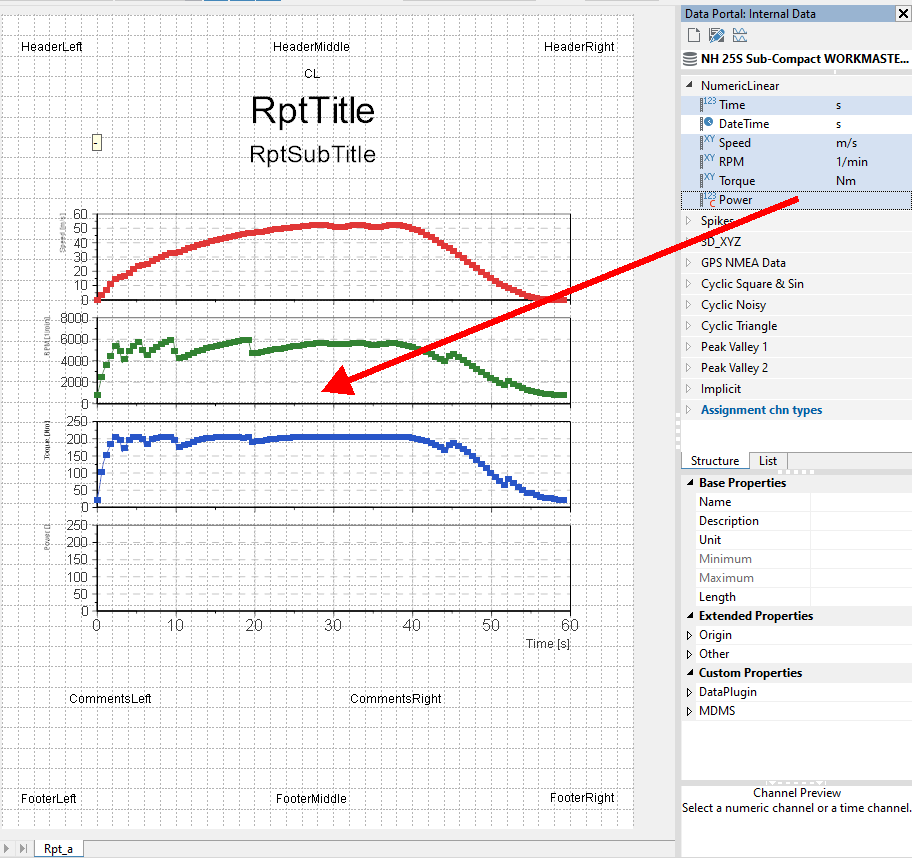 The charts on the report page will not have any curves visible because the X,Y,Z references have been removed in order to insure good report generation performance. In order to edit the formatting of a chart, you will need to assign X Channel, Y Channel, (and Z Channel if 3D chart) to the chart's x-axis, y-axis (and z-axis if a 3D chart). In this example, a 2D chart is shown that supports displaying multiple curves on the same chart with a separate y-axis for each curve. Find the channel group of interest and the Y Channels you wish to show on this report layout. If you want to plot up to four curves on the chart, then first click on the X channel, then while holding the CTRL key, click on the four Y Channels in the Data Portal from within the same channel group. Without moving the mouse pointer (already over the last channel you selected), release the CTRL key (the channels in the Data Portal should still be highlighted), and then drag and drop them on to the center of the 2D chart.