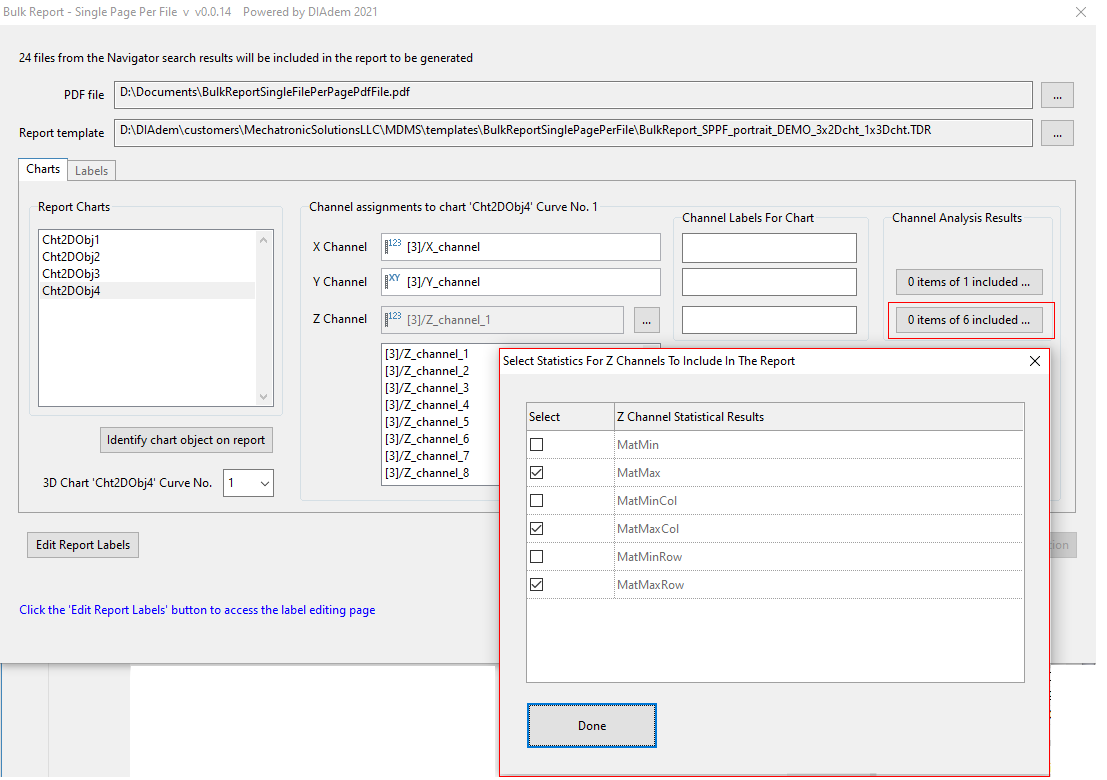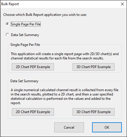 This application will allow you to perform a statistical analysis on one or more channels, for all of the files in the search results. The results from the analysis can then later be chosen to be included in the report generated by Bulk Report.