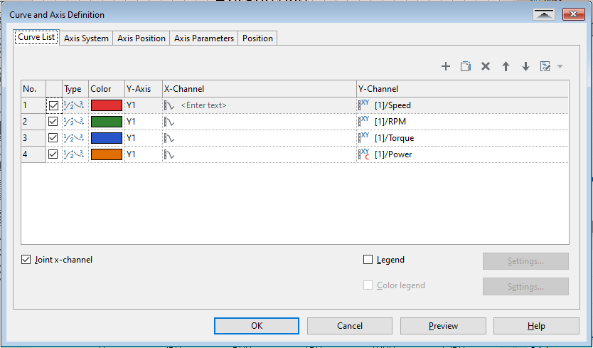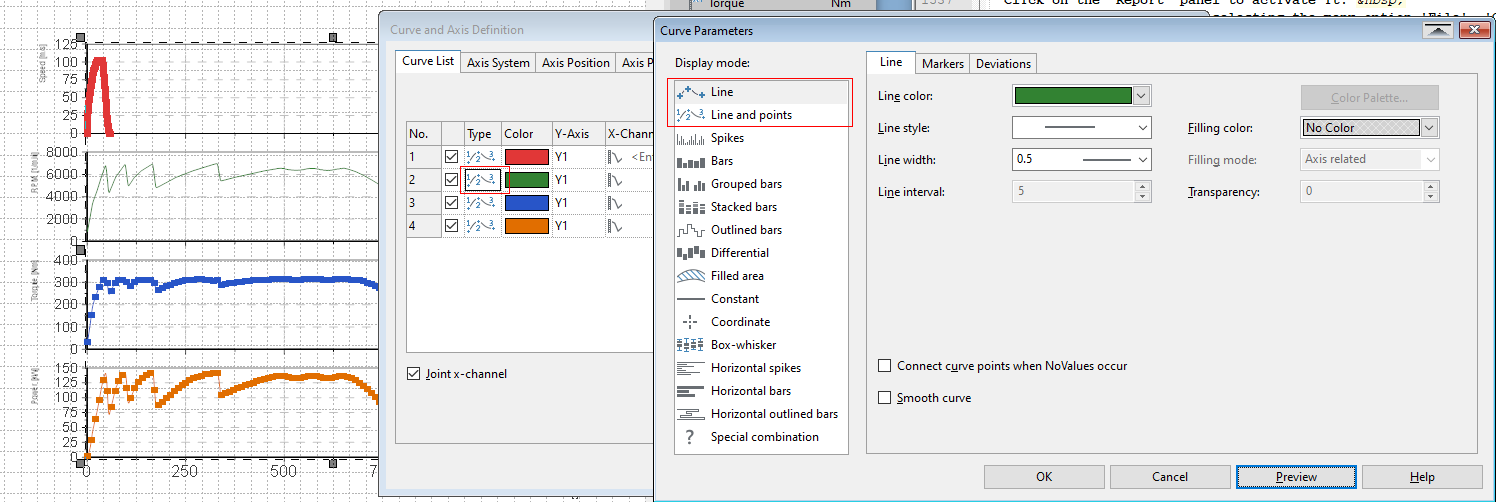 The curves are showing lines and points (markers), causing the curve to have very fat lines because the markers are stacked on top of each other. We are going to disable the display of the points (markers) for each curve. From the 'Curve List' tab, you can see the four curves listed. Click on the second curve 'Type' (second row labeled '2' and under the column labeled 'Type') to see a dialog that will allow you to change the type from 'Line and points' to 'Line'. Click the 'Preview' button to see the effect on the report chart. Then click 'OK' for that dialog, and 'OK' for the previous dialog. Repeat this process for the remaining three curves. Note that you could also change the curve line color, style, etc. Explore the options available from the 'Axis System', 'Axis Position', and 'Axis Parameters' tabs.