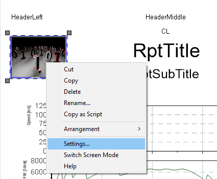 Click on the Report panel toolbar graphic/image icon and choose 'Load Graphic'. Browse for the image of the logo you wish to add to the report. You may choose graphic files with .png, .jpg, .jpeg, .gif, .tif, .emp, or .bmp file extension.