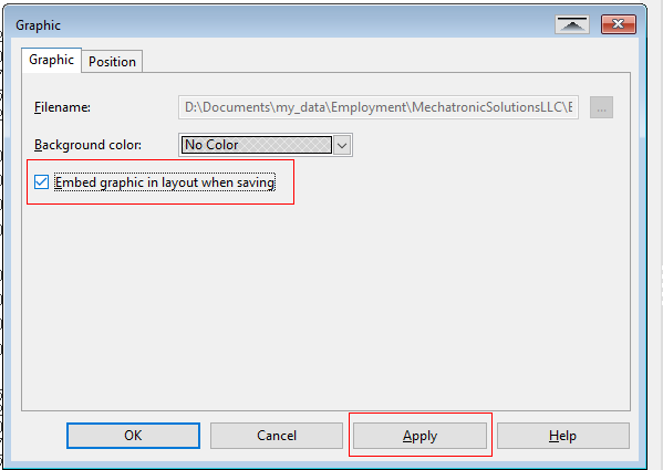 Click the checkbox labeled 'Embed graphic in layout when saving'. Click 'Apply', and then save the report template.