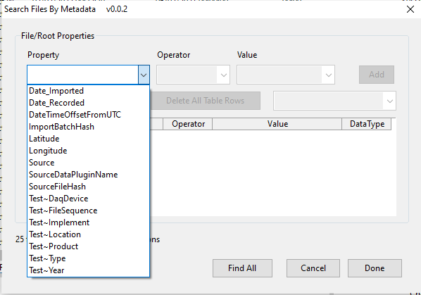 Click on the drop down list labeled 'Property' to see a list of all the metadata by keyword (file property name) added during Bulk Import.